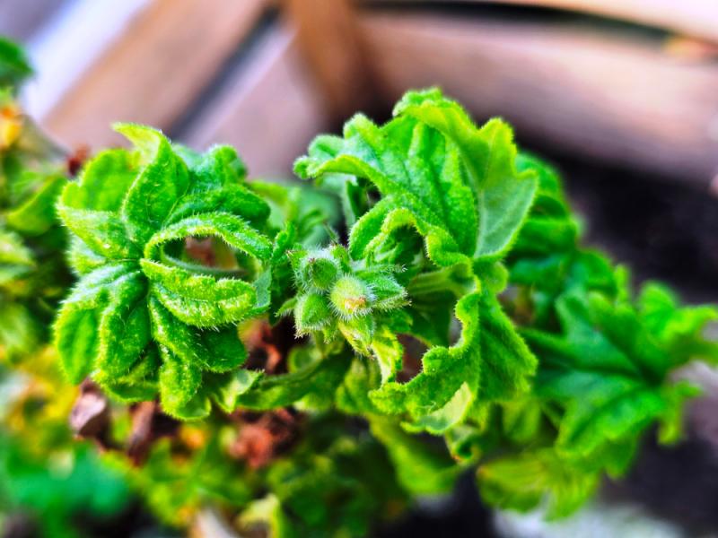 Pélargonium au port arbustif de faible croissance et développement, peu ramifié à hauteur de 15-20cm la première année de culture. Sa fragrance ‘citronnée’ est plus ou moins prononcée suivant vos perceptions. Tiges herbacées jeunes, devenant ligneuses avec le temps de culture. Présence de villosités et de poils glandulaires. Feuilles molles au toucher, crispées palmatiséquées de couleur vert, foncé sur face supérieure et plus clair sur face inférieure, 2 à 4 cm de long et 2 à 4 cm de large dans la forme crispée; stipules asymétriques triangulaire, 2 à 4 mm de long et 2-3 mm de large. Inflorescence discrètes en ombelle de 3-5 fleurs blanc à rose, plus petites que chez P. graveolens.
