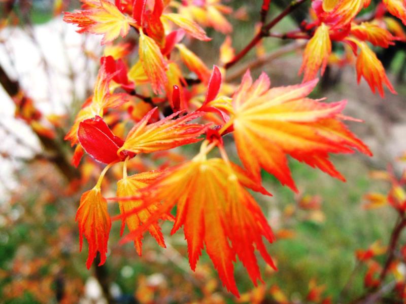 Arbuste élancé, à croissance verticale, bien ramifié, jusqu’à 8 m de haut en plantation pleine terre. Écorce verte fraîche, feuilles à 5 lobes, ou parfois 7 lobes, quelque peu froissées à l’état juvénile. Marginé Jaune-orangé vif au printemps, pas très différent du cultivar 'Katsura' avec lequel il est difficile de le différencier. Cependant le fait de devenir vert jaunâtre à l’automne, puis jaune donne un indice pertinent .