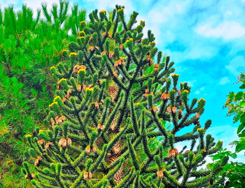 Du Chilien araucanos, nom local de la plante. Origine hémisphère sud Amérique du Sud, Argentine, Chili. 800 à 1600 m d’altitude introduit en 1795. Désigné communément ‘Désespoir du singe’.