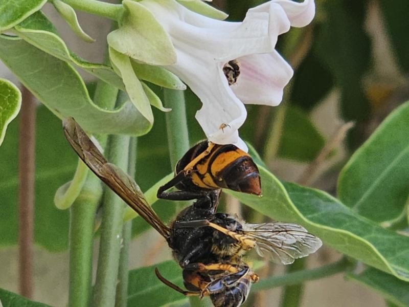 Végétoscope: Plante odorante et mellifère, piégeuse de très nombreux insectes dont abeilles et papillons mais aussi indirectement intermédiaire pour piéger les frelons asiatiques (photo ci contre), les fleurs, présentant un pollen gluant, sécrètent également des sucs nectarifères asphyxiants et sont équipées d’une sorte de pince pourvue de poches polliniques qui emprisonnent les insectes. Cependant, après observation sur plusieurs heures tous les insectes ne sont pas systématiquement piégés et beaucoup repartent avec plus ou moins de facilité. On pourrait peu être envisager qu’elle régule la biodiversité si elle est Plantée d’une manière raisonnée. De plus elle est visitée régulièrement, de jour comme de nuit, par des papillons comme le sphinx colibri Macroglossum stellatarum.