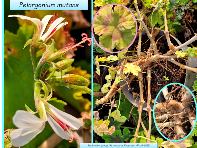 Plante ramifiée, tentaculaire avec des tiges plutôt épaisses de 30 à 40 cm de diamètre sur 2 années de culture. Feuilles aromatiques avec une odeur « piquante », non douce, vert vif normalement avec une zone violacée à mi-chemin de la marge, orbiculaire, 5 lobes à zone marginée et base cordée, 10 cm de diamètre; pétiole 3-4 cm; stipules ovales, larges d’environ 5 mm. fleurs irrégulières aux pétales linéaires de couleur blanc crème.