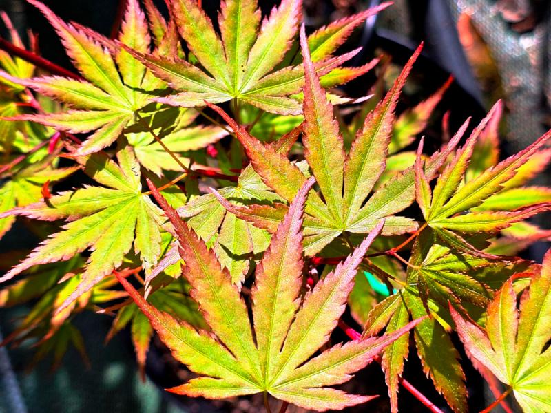 Greffage en plaquage à lanière à l’automne voir printemps sur plant d’Acer palmatum de semis de 1 an. Repiquage en godets de 8-9 au printemps puis empotage en conteneur de 2 ou 3l N+1 suivant la croissance des plants. Formation sur tige avec tuteurage ou formation en arbuste avec taille adéquate suivant la durée du processus de production. Substrat drainant de pépinière à base de tourbe, terreau, écorce de pin et pouzzolane (facultatif). Fertilisation avec incorporation d'engrais à libération programmée en 2ème année de culture.