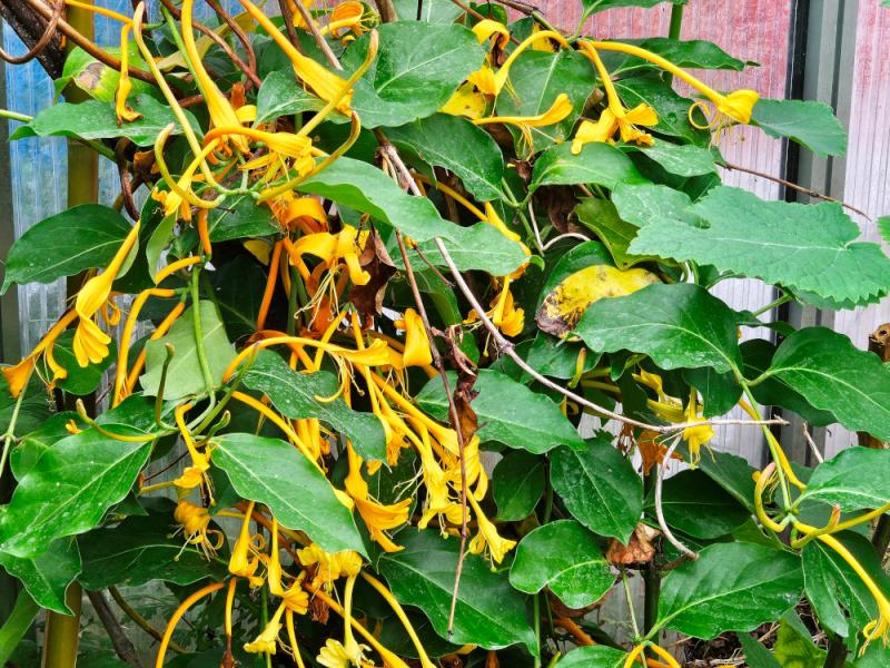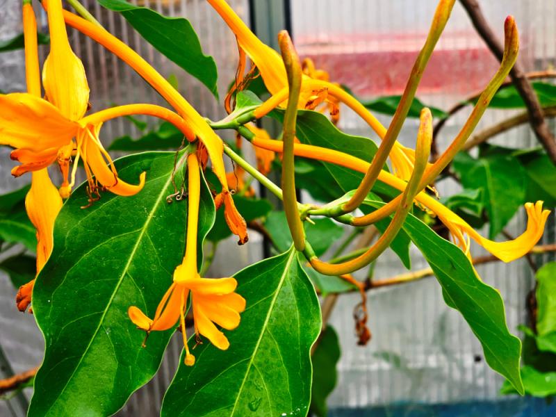 Arbuste grimpant à souche sarmenteuse beige se desquamant en bandes étroites ; très vigoureux, pouvant atteindre 10- 12 m de hauteur, entièrement glabre. Feuilles brièvement pétiolées, ovales à elliptiques, long. : 7 a 15 cm et larg. de 2/3, acuminées, face sup. vert foncé luisant, face sup. parsemé de quelques glandes brunes. Inflorescence : En grandes panicules de fleurs odorantes axillaires de 8 à 15 cm de longueur, à tube mince, s'ouvrant en 2 lèvres récurvées d'une largeur totale de 6 a 8 cm de couleur d'abord blanc crème passent à l'orange. Fruits : Baies vertes globuleuses à pyriformes de 2,5 cm, de couleur bleu foncé à maturité.
