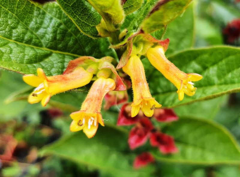 Arbuste dressé, dense, atteignant 1 à 2 m de hauteur. Forme souvent arrondie ou buissonnante, non volubile. parfois sarmenteux, à rameaux ériges, anguleux lorsqu'ils sont jeunes et rapidement glabres. Feuilles épaisses, ovales lancéolées, de 5 a 1O cm de longueur, de largeur d’environ moitié moindre, a base arrondie ou tronquée, acuminées, vert foncé légèrement lustré dessus, pubescentes dessous, pétiole de 3 a 5mm. Inflorescence: Floraison d' Avril à juin (selon climat). Fleurs axillaires, sur un pédoncule de 2-3 cm. Petites fleurs tubulaires, légèrement parfumées de couleur jaune crème à jaune verdâtre, disposées en paires, typiques du genre Lonicera, accrescentes après la fécondation. Fruits pisiformes noirs sous forme de baies noires, entourées de bractées rouges.